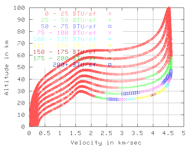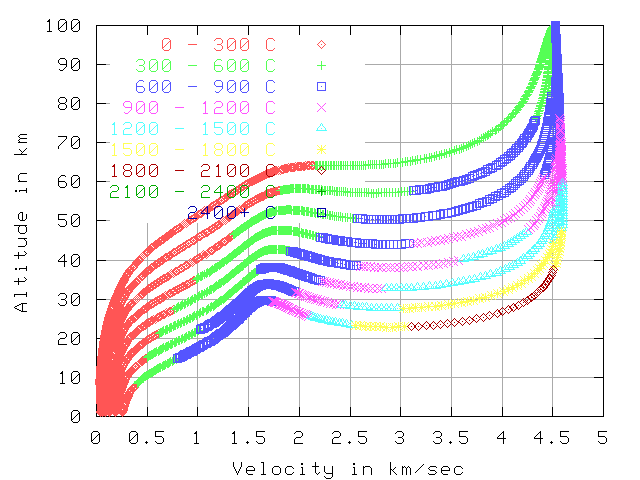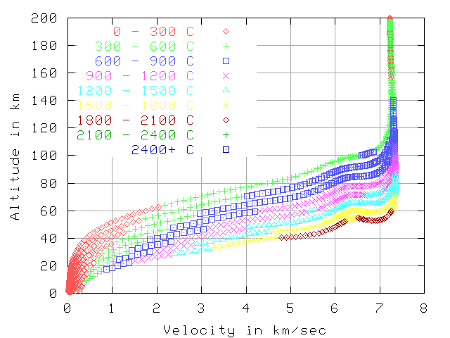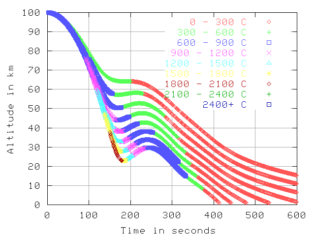 The graphs each have 8 curves for 8 blunt reentry vehicles. The y-axes shows the altitude. In the first 6 graphs the x-axes show the speed relative to the air, in the last 2 graphs the x-axes shows the time. The vehicles all have the same weight (10,000 Kg) and the same L/D of 0.5. The difference between the vehicles is in the amount of drag area they have. Thedrag areas shown are 640, 320, 160, 80, 40, 20, 10, and 5 sq-meters. In each graph the 640 sq-meter area vehicle is the top curve, as it slows down at a higher altitude. The other vehicles are in descending order according to drag area below the 640 sq-meter vehicle.