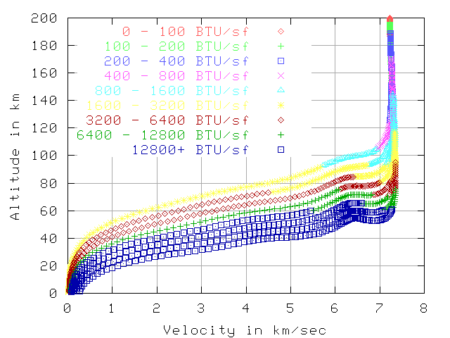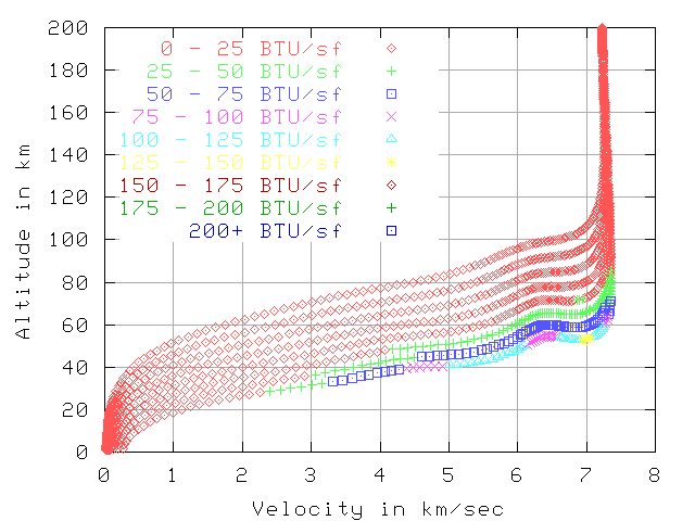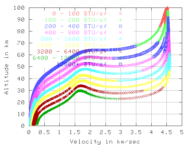 The larger area reentry vehicles in the graphs could only be done with some rather novel method. Something like a big parachute with an inflated rim so it would work at high altitudes. But this would not be the blunt shape that these graphs assume, so the edges of the parachute would be hotter than shown here. Still, there are some high temperature cloths so maybe this is possible.